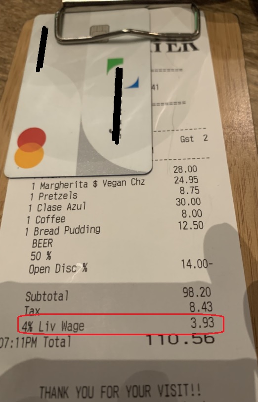 We had dinner earlier this week in Marin County and noticed something new on our bill – a 4 percent living wage surcharge! We seriously doubt the effective food price increase shows up in the “food away from home” component in the CPI inflation and/or average hourly earnings. Isn’t transparency supposed to be a hallmark of a market economy?