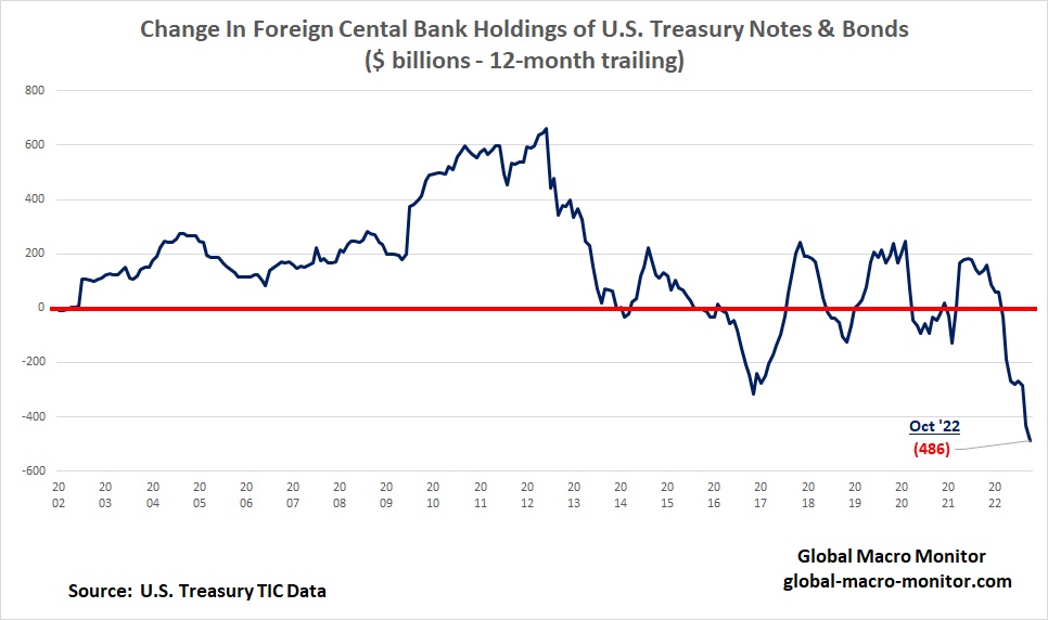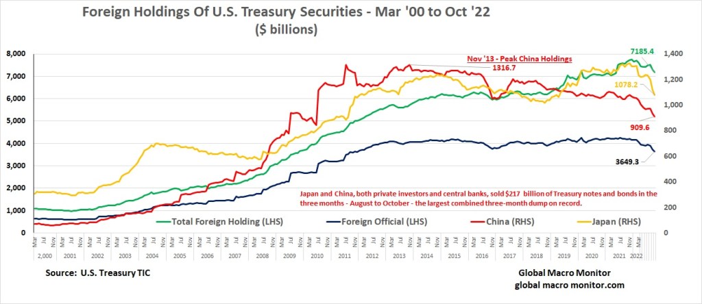 Last week’s TIC data confirms foreign central banks are still dumping their Treasury note and bond holdings. Japan and China, both private and official, and the two largest foreign creditors to the U.S. Treasury, reduced their note and bond holdings by $217 billion from August to October, the largest three-month dump on record (see chart below).