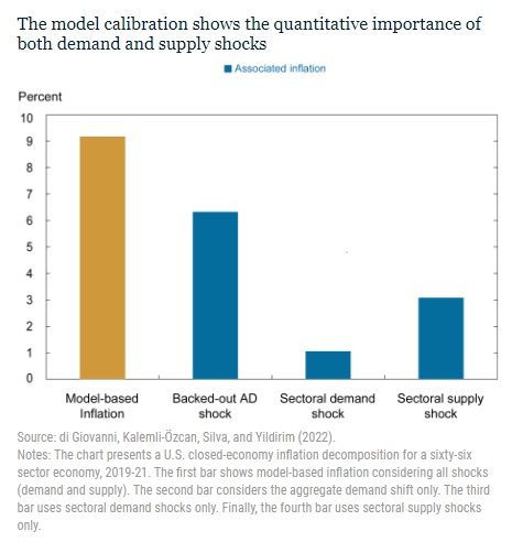 The current debate on whether the Federal Reserve can engineer a soft landing needs to disentangle the drivers of U.S. inflation. Our work shows that inflation in the U.S. would have been 6 percent instead of 9 percent at the end of 2021 without supply bottlenecks. Our quantitative results clarify why some pundits were wrong to predict a transitory surge in inflation, while others were right in predicting high inflation, but for the wrong reasons. Put differently, fiscal stimulus and other aggregate demand factors would not have driven inflation this high without the pandemic-related supply constraints. In the absence of any new energy or other shock, it is therefore possible that the ongoing easing of supply bottlenecks will cause a substantial drop in inflation in the near term. – NY Fed