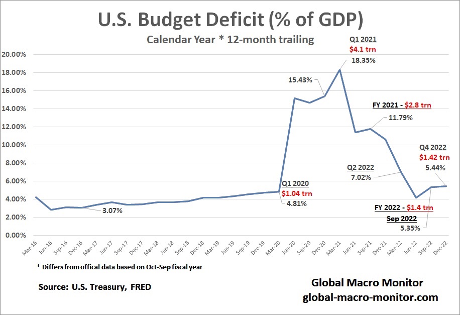 The U.S. budget deficit has stabilized from the COVID shock and is beginning to tick up again. The budget shortfall is set to move higher, driven by interest payments on the national debt as the interest rates are now significantly higher, coupled with lower tax revenue as the economy slows.