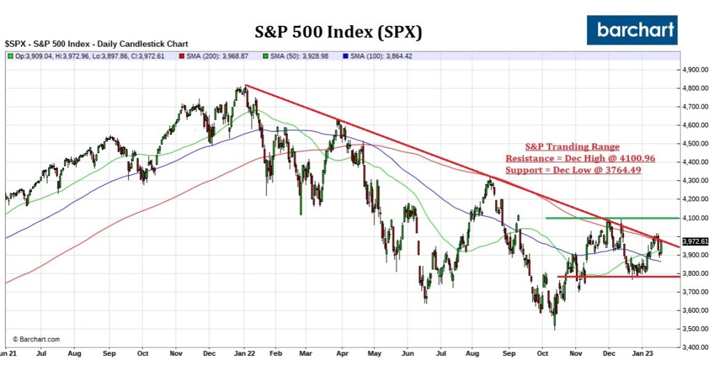 The S&P 500 index closed the week right on its 200-day moving average. The index is trading in a 300-point range, bookmarked by the December low at 3746.49 and high, at 4100.96. It’s positive the index has stayed above the December low for the month of January.