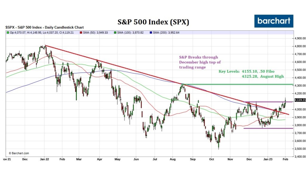 As we noted Friday, watch for a break out above the 4100.96, the December high, and the top of the trading range. . The index traded almost to its key .50 fib at 4155.10 before backing off into the close.