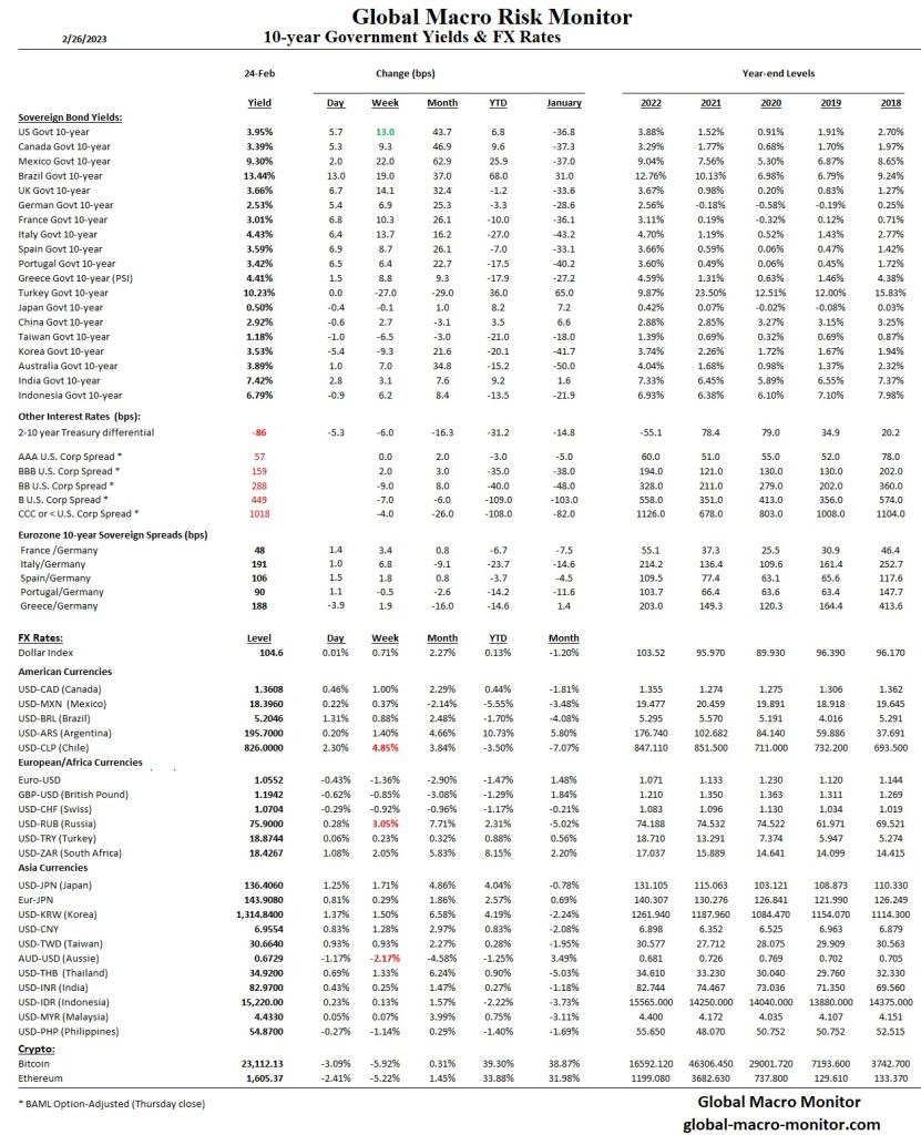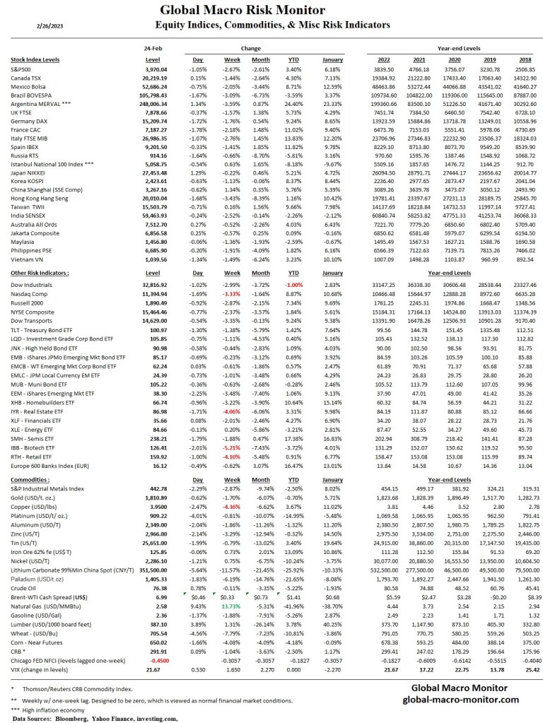 Ten-year yields were up across the globe as the U.S. Treasury note yield approaches 4 percent on sticky inflation data. Consequently, world stocks fell across the board, with the S&P 500 down 2.7 percent on the week and the Dow now down 1 percent, YTD. Biotech, real estate, and retail were hammered.