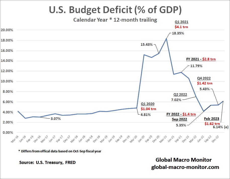 After normalizing post-COVID, the U.S. budget deficit is starting to turn up again. The 12-month trailing deficit was $1.62 trillion at the end of February, or around 6.14 percent of GDP. Good luck bringing inflation down to 2 percent, given those digits and trend. Moreover, financing the gaps during normal times without the Fed and a flight-to-quality bid for Treasury securities will be a challenge for the markets and will put upward pressure on interest rates.