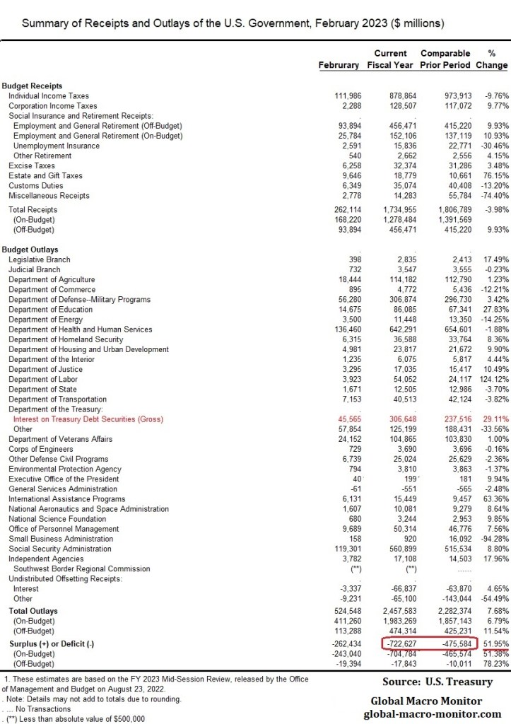 Interest payments on the national debt during the current fiscal year (October to February) are up 29 percent y/y, one of the fastest-growing expenditure components of the Federal budget (see table).
