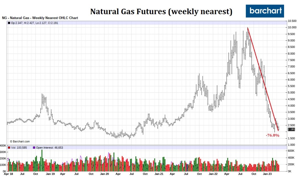 Jaysus (h/t CG), U.S. natural gas (Nattie) futures are down 76.7 percent from last August’s peak. Moreover, European Nattie prices are down 87 percent from the highs.