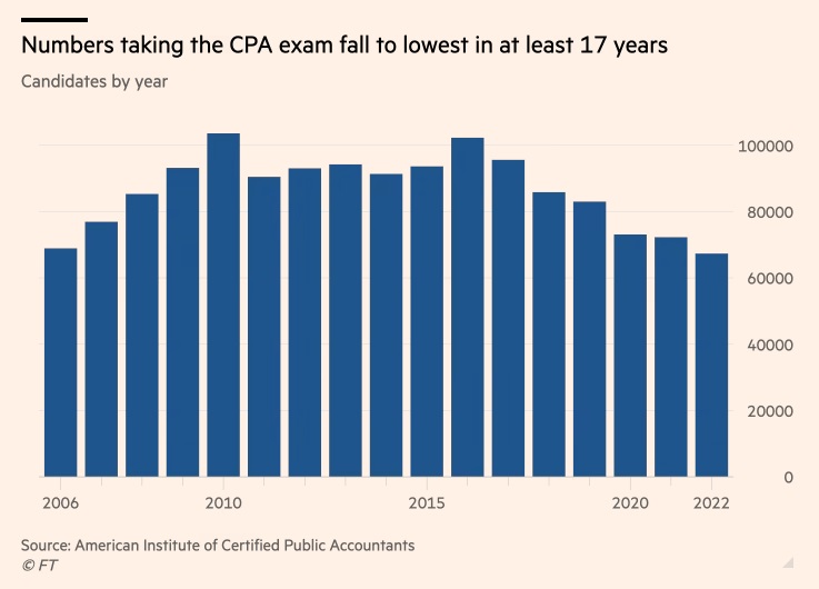 Good piece in the FT about the number of people taking the CPA exam in 2022 has dropped to its lowest level since the beginning of records for the modern exam in 2006.