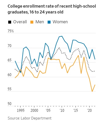 The college-enrollment rate has fallen for both men and women in recent years, but more so for men. Last year 66.1% of women who graduated from high school, ages 16 to 24, enrolled in college, nearly 10 percentage points higher than the rate for young men, which economists attribute to women enjoying greater financial returns from college. – WSJ