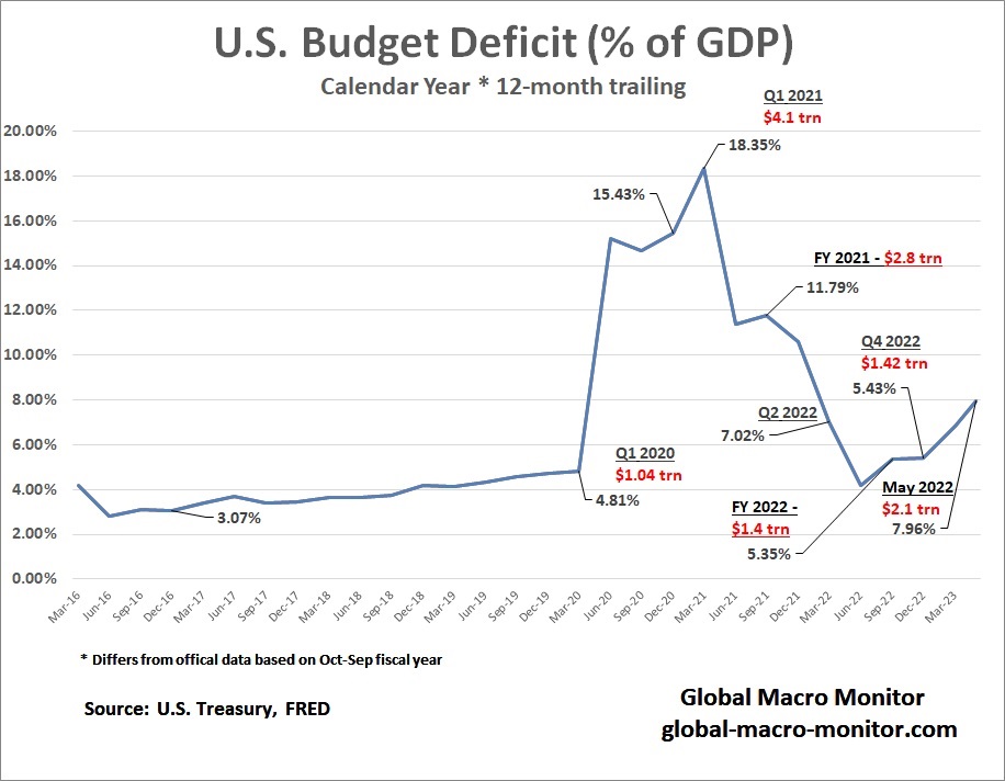 The U.S. budget deficit keeps climbing, approaching 8 percent of GDP as the 12-month trailing shortfall reached $2.1 trillion in May. Budget receipts in May were down 20 percent year-on-year, most likely due to lower tax receipts from a slowing economy, falling capital gains receipts, and some technical factors.