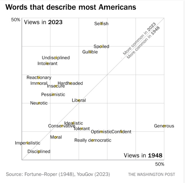 In 1948, half of Americans viewed their fellow Americans as “generous.” Now, the descriptor that was most widely applied was “selfish.”