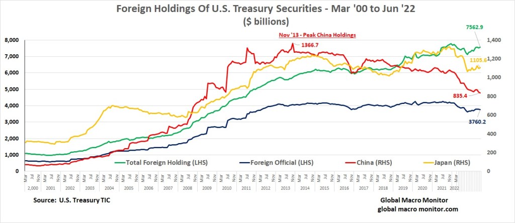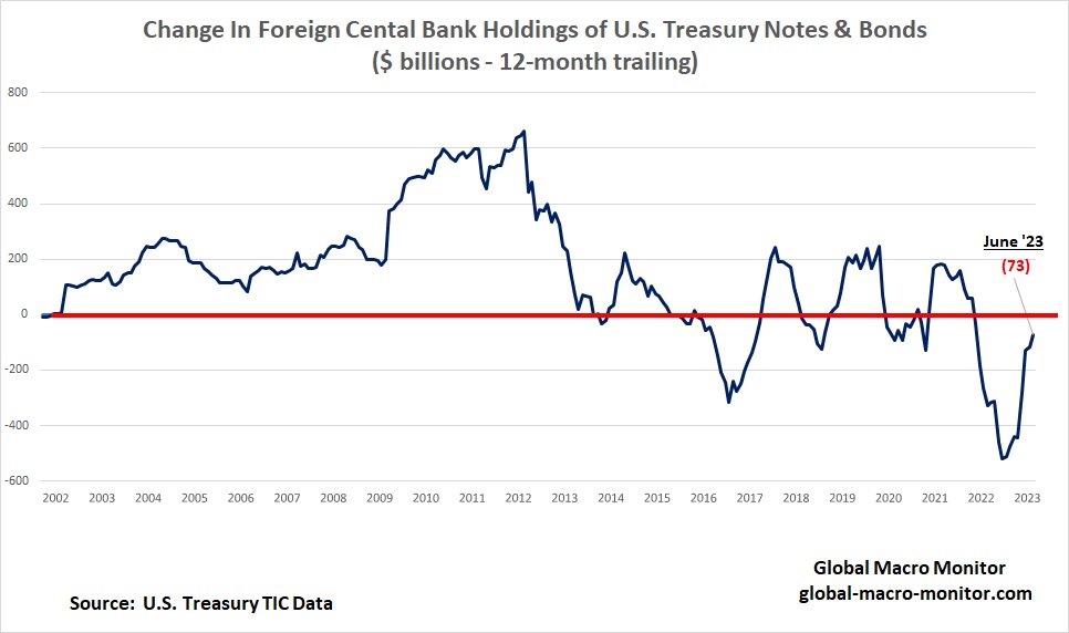 Today’s release of the U.S. Treasury International Capital (TIC) flows data highlights a continued trend of foreign central banks reducing their holdings of U.S. notes and bonds, albeit at a notably decelerated pace. Between June ’22 and June ’23, foreign central banks divested $73 billion in Treasury notes and bonds. This divestment rate is notably more gradual compared to the preceding six months, mainly due to the big dumps observed in 2022 rolling out of the 12-month cumulative total.