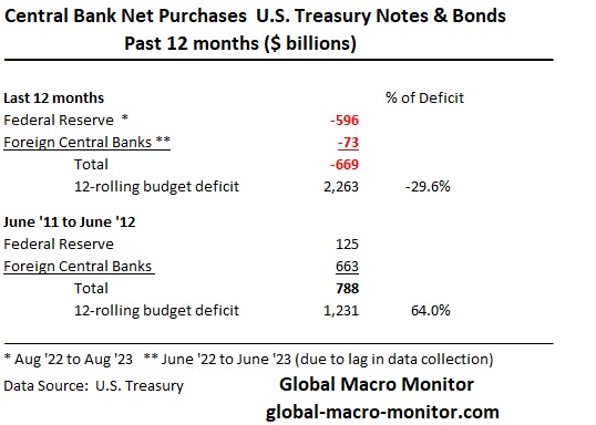 By contrast, looking back to June 2012, foreign central banks acquired $663 billion in notes and bonds on a rolling 12-month basis, whereas the Fed’s acquisitions amounted to $125 billion. The former purchases were rooted in a strategic policy to prevent excessive appreciation of exchange rates, while the latter transactions constituted part of the Fed’s quantitative easing strategy, both characterized by a complete lack of price sensitivity.