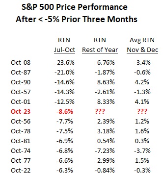 The index entered November after generating three consecutive months of negative returns, falling 8.61 percent since the end of July. Only five times in the last seventy-three years has the S&P500 entered November after such a poor performance in the prior three months. The following table shows that in three of those times, the performance for the rest of the year was negative, while in the other two instances, the S&P was up north of 8 percent.