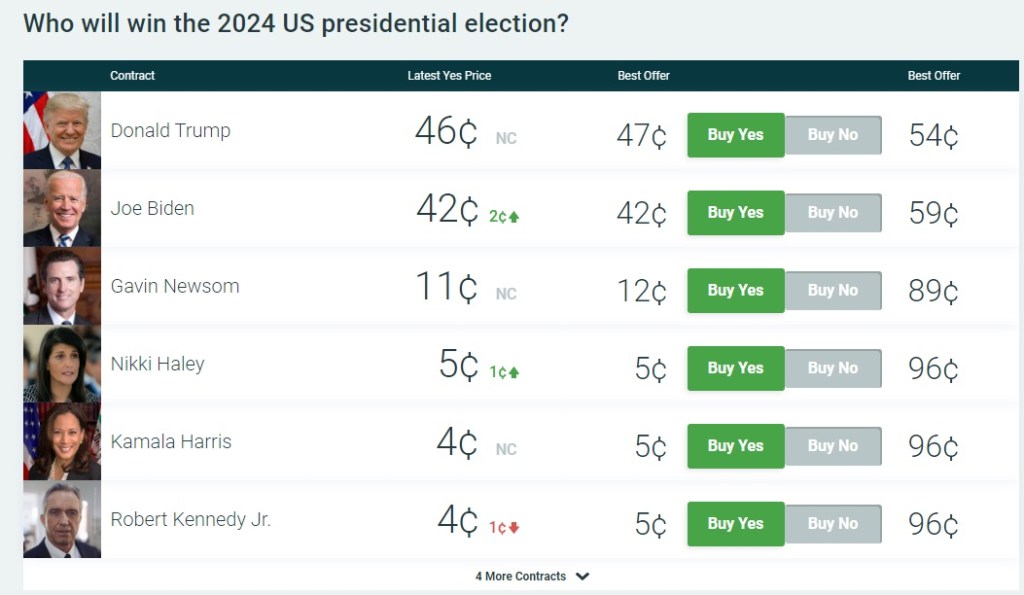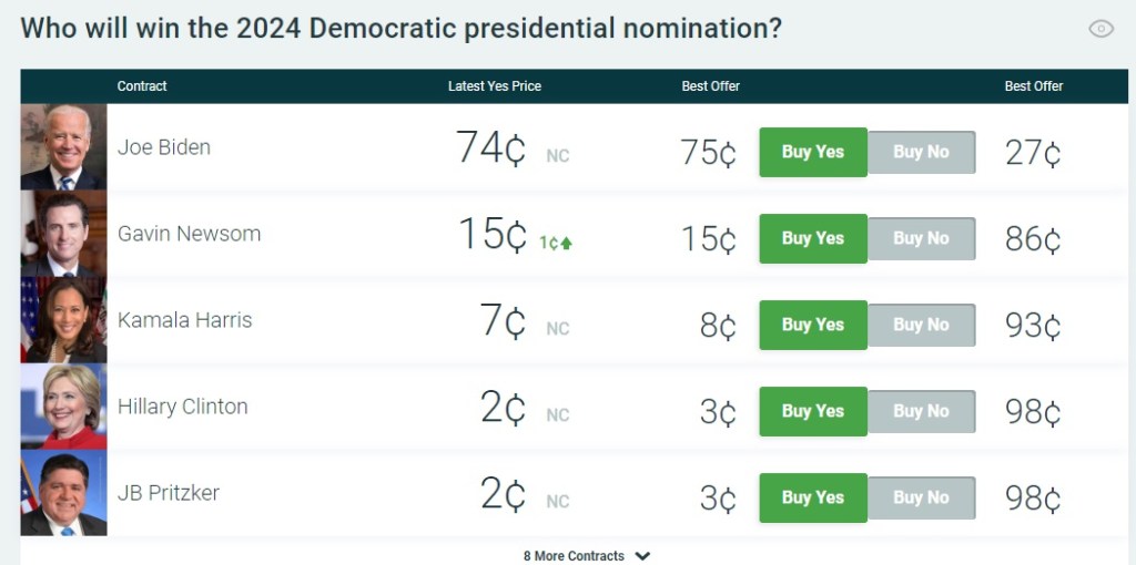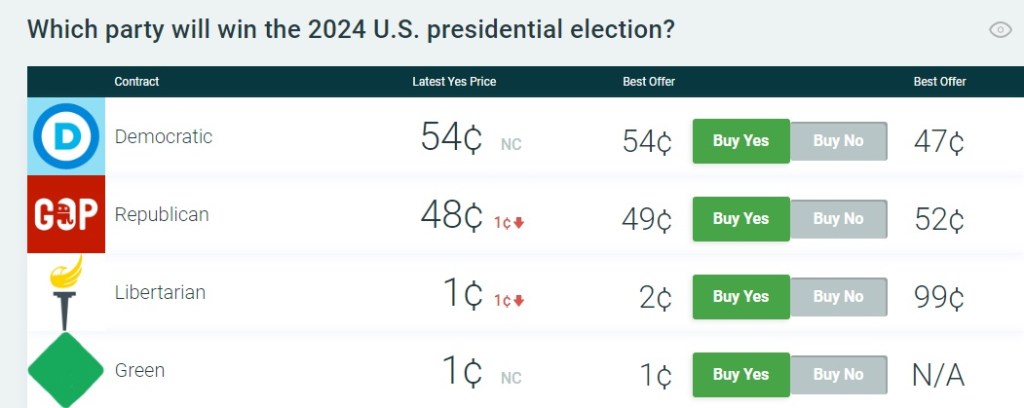 The site is pricing the Democratic Party to win the presidential election at $.54 (think of it as a probability), with the Republican Party priced at $.48. However, PreditIt has Donald Trump priced at $.46 to win the election with President Biden priced at $.42.