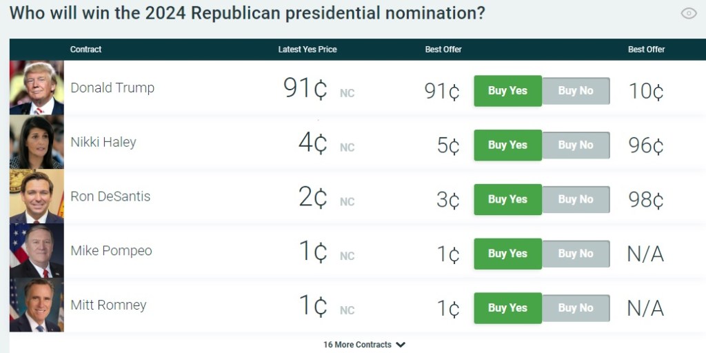Nevertheless, the market is pricing Biden with only a 74 probability of being his party’s nominee versus Trump’s 91 percent.