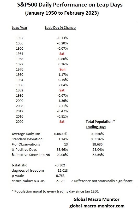 The following table illustrates that of the 13 leap trading days (February 29) since 1950, when the markets were open, the average leap day return is -0.06 percent versus 0.0356 percent for the total population of 18,686 trading days.