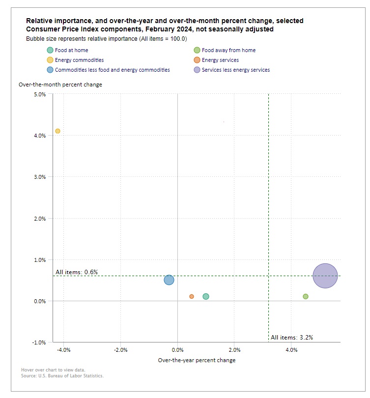 The Consumer Price Index for All Urban Consumers (CPI-U) edged upward by 0.4 percent, a notch above January’s rise, based on the CPI survey conducted by the U.S. Bureau of Labor Statistics. This measure, a barometer of the urban dweller’s cost of living, mirrored the broader passage of time with a 3.2 percent ascent over the past year, unadjusted for the season’s whims.