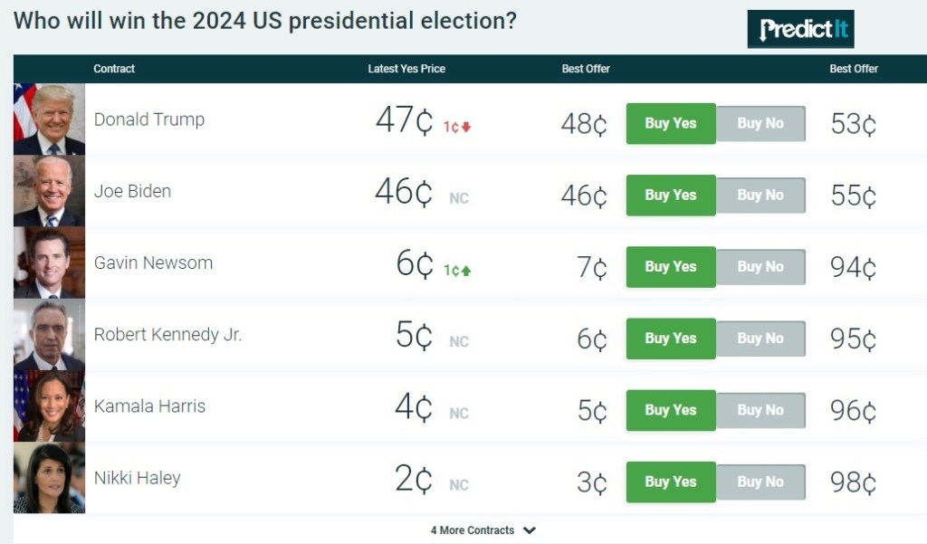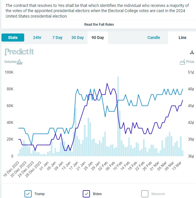 President Biden’s probability of being re-elected, as measured by the betting markets at PredictIt, has closed a 6-point gap between him and the former president. As you can see from the chart, Biden’s predicted probability of being re-elected took a tumble after the special prosecutor’s report labeled POTUS as,