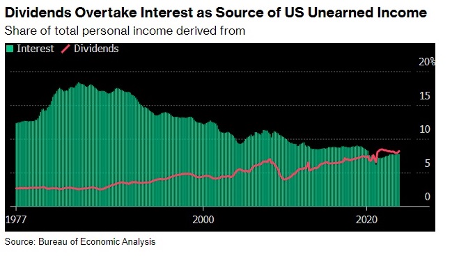 - Shift in Wealth: There’s been a shift from interest-bearing assets to stocks, with dividends surpassing interest payments as a source of unearned income during the pandemic.