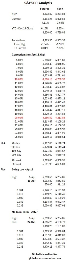 Given the current market narrative of higher for longer, we maintain our view that the S&P 500 is destined for its 200-day moving average of around 4,680.43 before this downdraft concludes. We will reassess if the cash index takes out the .50 Fib level at 5119.44.
