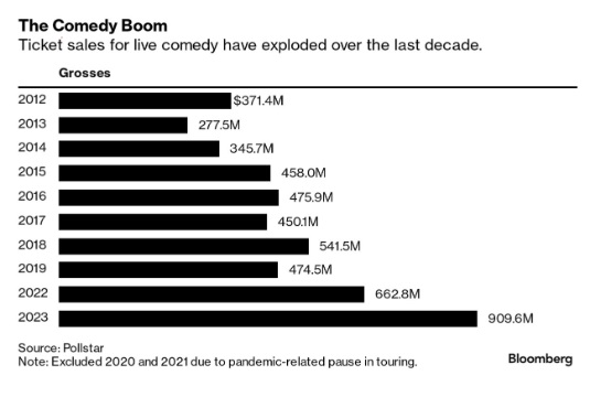 Stand-up comedy grosses have nearly tripled over the last decade, climbing to more than $900 million last year, according to Pollstar. – Bloomberg