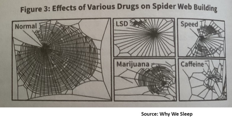 To impress upon you the effects of caffeine, I footnote esoteric research conducted in the 1980s by NASA. Their scientists exposed spiders to different drugs and then observed the webs that they constructed. Those drugs included LSD, speed, marijuana, and caffeine. The results, which speak for themselves, can be observed in the figure [below]. – Matthew Walker, Why We Sleep