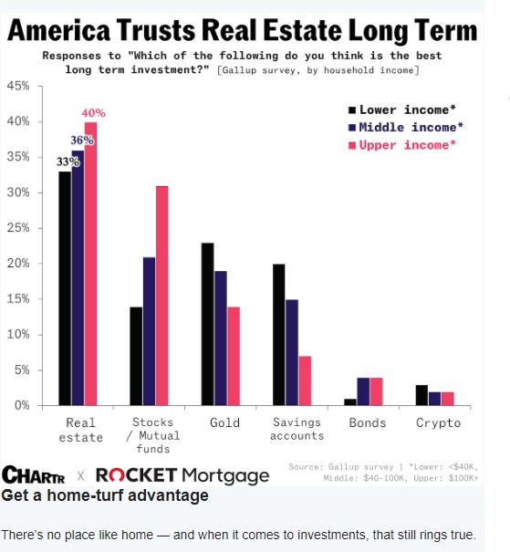 - Income Level Investment Perceptions: Across all income levels, Americans perceive real estate as a superior investment. However, opinions diverge on the value of other investments, particularly stocks and savings accounts.