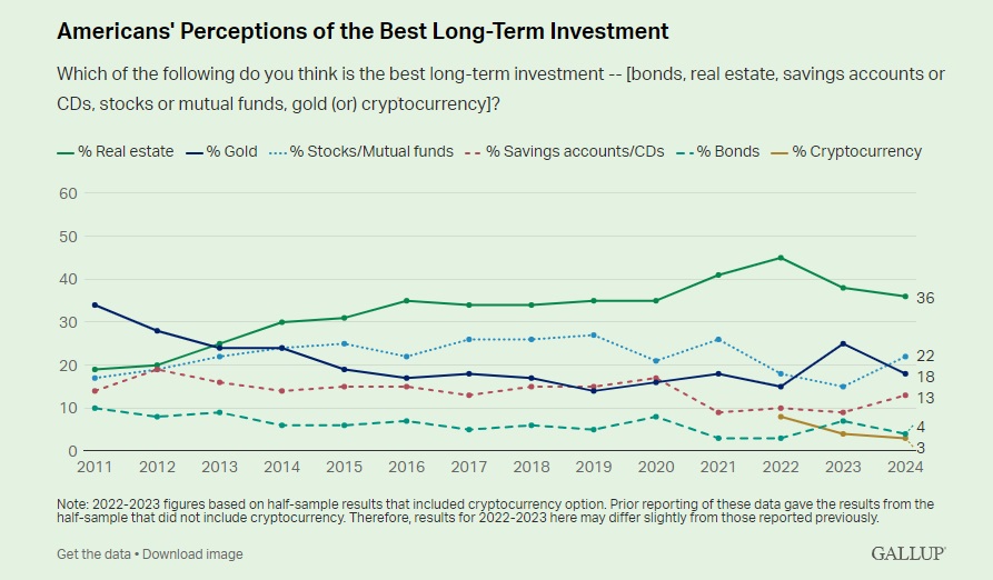 Gallup has asked Americans to choose among real estate, stocks, gold, savings accounts and bonds as the best investment. Cryptocurrency was added as an option in 2022.