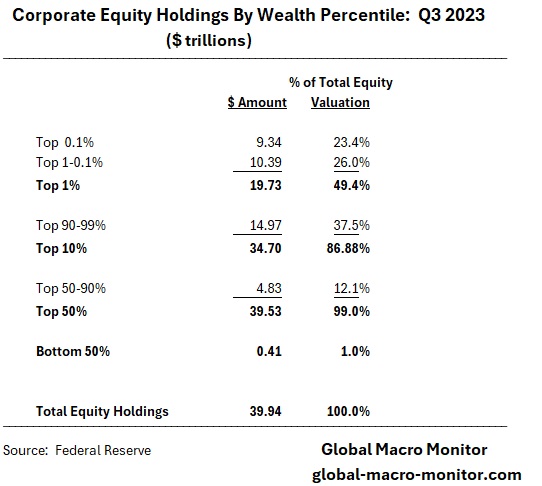 - Stock Ownership Disparity: Stock holdings are heavily concentrated among the wealthiest Americans. The top 0.1% owns 23.4% of corporate equities, the top 1% controls nearly half of the stock market, while the bottom 90% hold only 13.12% of corporate equity wealth.