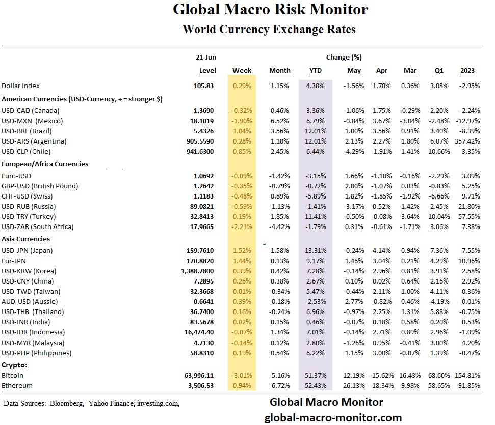 - The Dollar Index increased by 0.29% to 105.83, up 4.38% for the year.
