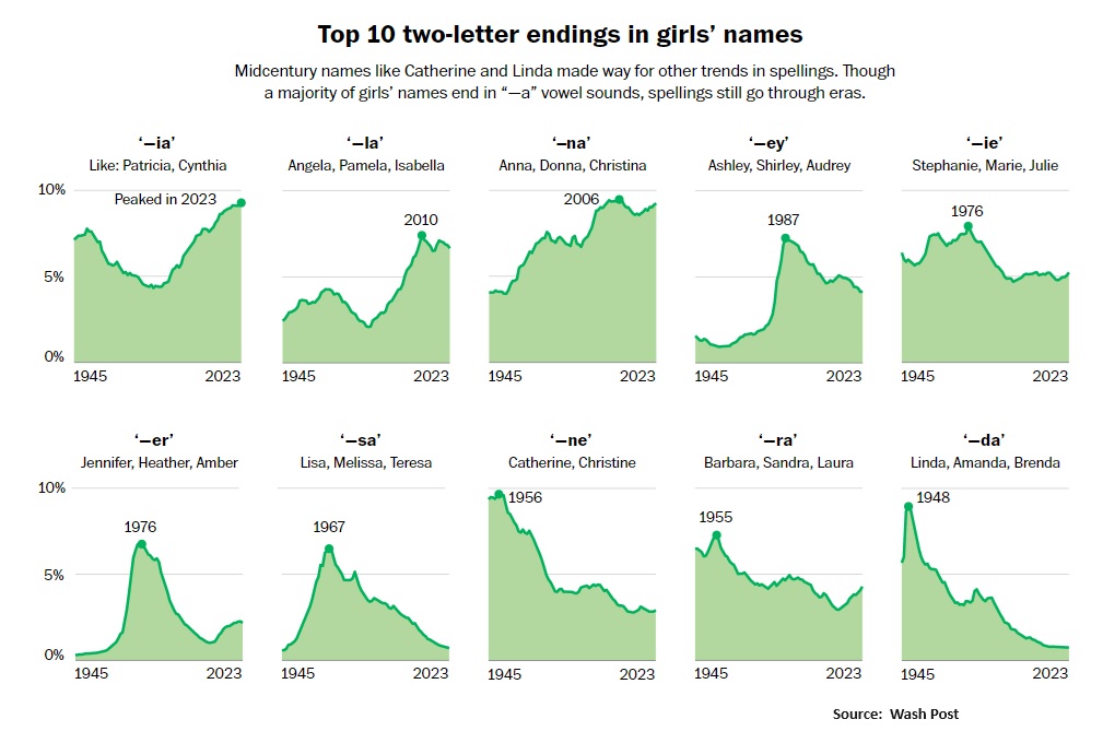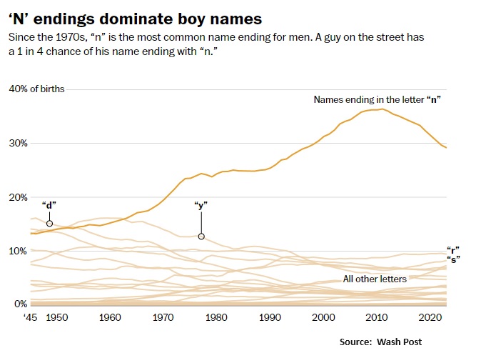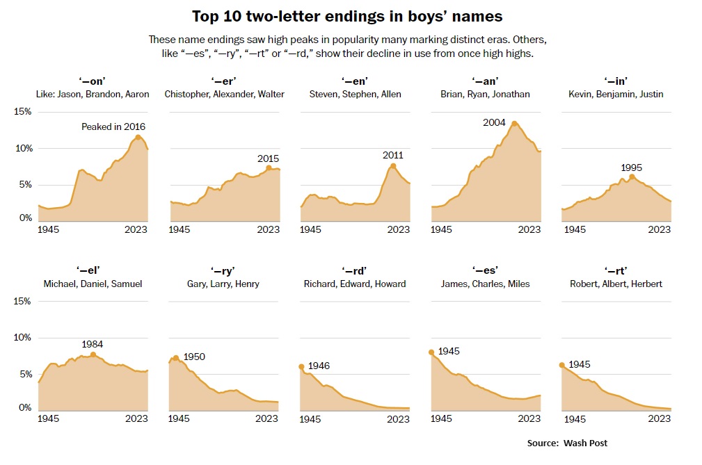 Wattenberg finds “an incredible irony” in this. People think they’re choosing something totally unique, but they do it in a way that winds up moving with the zeitgeist. As a result, names have a , with nearly half of all baby names now following identifiable suffix trends — a phenomenon Wattenberg calls “lockstep individualism.” – Washington Post