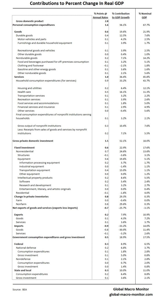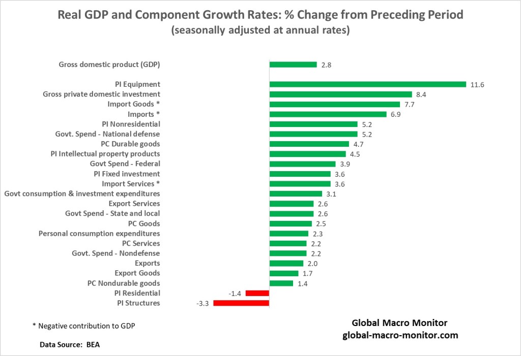 The US economy grew faster than expected last quarter, with GDP rising at a 2.8% annualized rate compared to 1.4% in the previous quarter. This growth was driven by strong consumer demand and business investment, including an outsized increase in nonfarm inventories.