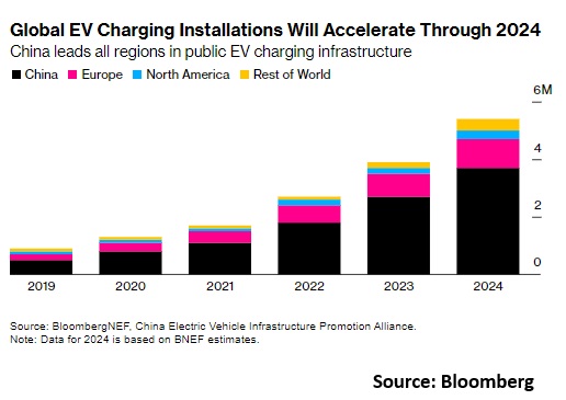 EV charging infrastructure is growing around the world, aided by billions of dollars in government incentives. Installations are expected to rise by at least 800,000 in the second half of this year, a third more than the numbers posted from January through June, according to BloombergNEF estimates. Trends suggest China may see more installations in the final three months of the year, while government grants in the US and new entrants such as the automakers’ joint venture Ionna could boost growth in North America beyond 2024 despite slowing EV sales. – Bloomberg