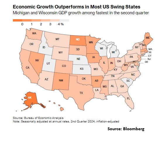 Six of the seven key battleground states in the upcoming U.S. presidential election registered economic growth faster than the national average in the second quarter. Michigan, Wisconsin, and Pennsylvania, which have been slower to recover post-pandemic, experienced a strong economic resurgence. Michigan and Wisconsin were among the top 10 fastest-growing states, and Pennsylvania rebounded after a contraction in the first quarter. The economic momentum in the swing states provides a political boost for Vice President Kamala Harris, who has been narrowing the gap with Donald Trump on economic issues in recent polls.