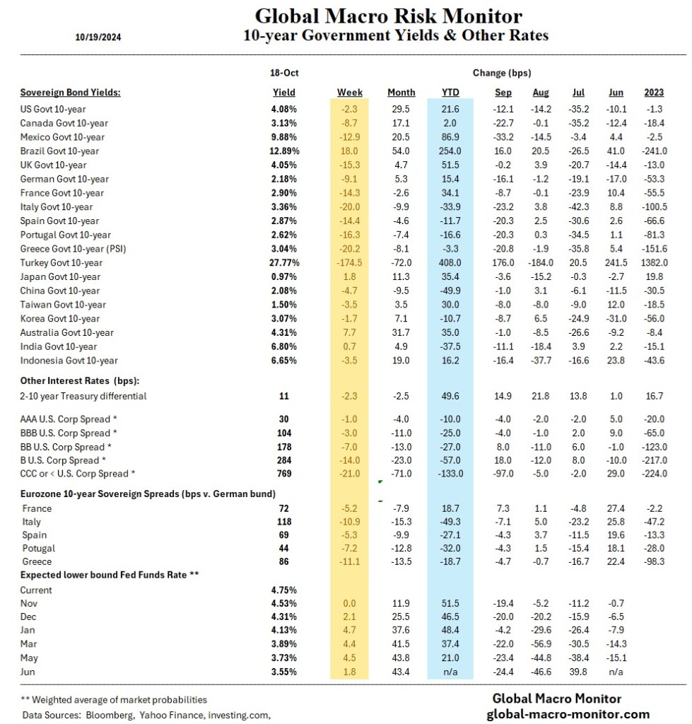 Big rally in Eurozone bond markets as the European Central Bank (ECB) reduced its key interest rate to 3.25%, marking its third 25 basis point cut this year. The decision reflects the ECB’s focus on lowering inflation risks and addressing a weaker growth outlook. The Governing Council stated that disinflation is progressing, with euro area inflation easing to 1.8% in September, below the 2% target for the first time in three years.