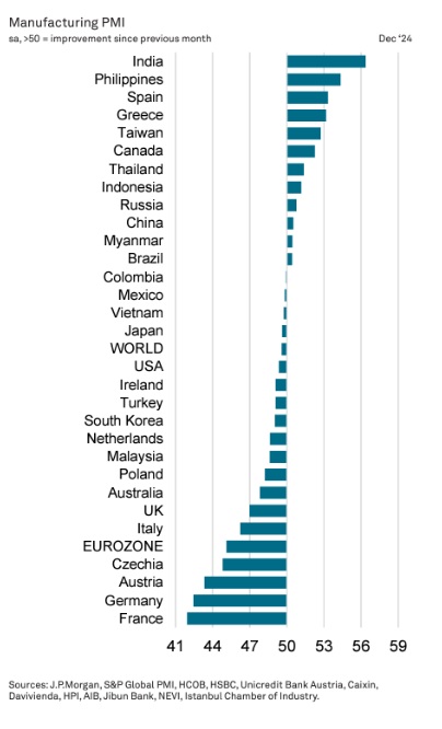 The global manufacturing sector ended 2024 on a weaker footing, with both output and new orders contracting in December. These declines erased the gains of the previous two months, resulting in near-stagnation for the final quarter. Only 13 of the 30 nations surveyed reported production growth, led by India, the Philippines, and select eurozone nations like Spain and Greece. In contrast, industrial heavyweights such as France and Germany faced sharp contractions, indicative of broader eurozone challenges.