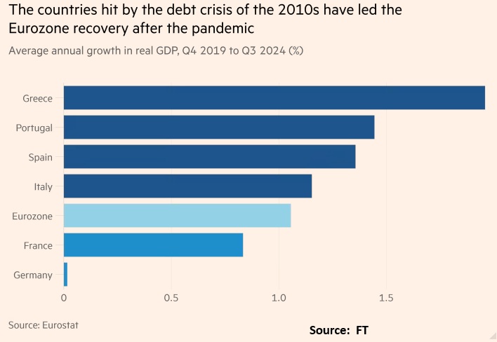 The Eurozone is experiencing a significant shift as the southern nations plus —Portugal, Italy, Ireland, Greece, and Spain—outperform their northern counterparts, particularly Germany, which faces economic stagnation. This reversal stems from targeted structural reforms, substantial EU investments, and favorable industry dynamics, including a reliance on tourism and green energy.