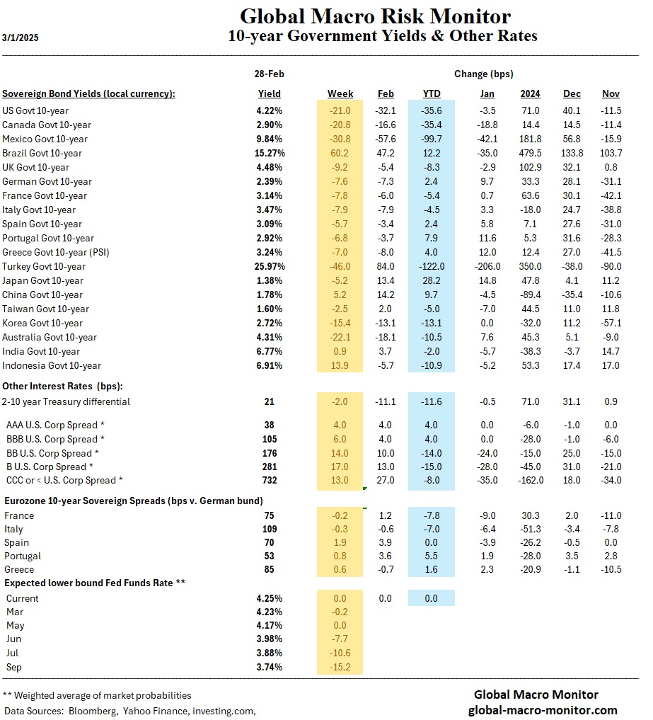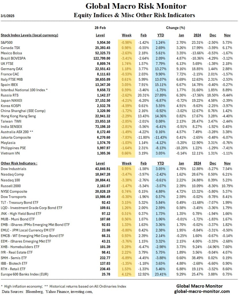 The past week saw heightened market volatility, with the S&P 500 and Nasdaq declining due to fading AI momentum and a growth scare, while the Dow Jones outperformed. The Atlanta Fed’s GDPNow model slashed Q1 GDP growth projections to -1.5%, signaling a potential contraction, exacerbated by weaker consumer spending and falling confidence levels. The bond market is flashing recessionary signals, as Treasury yields fell, and the yield curve remains inverted.