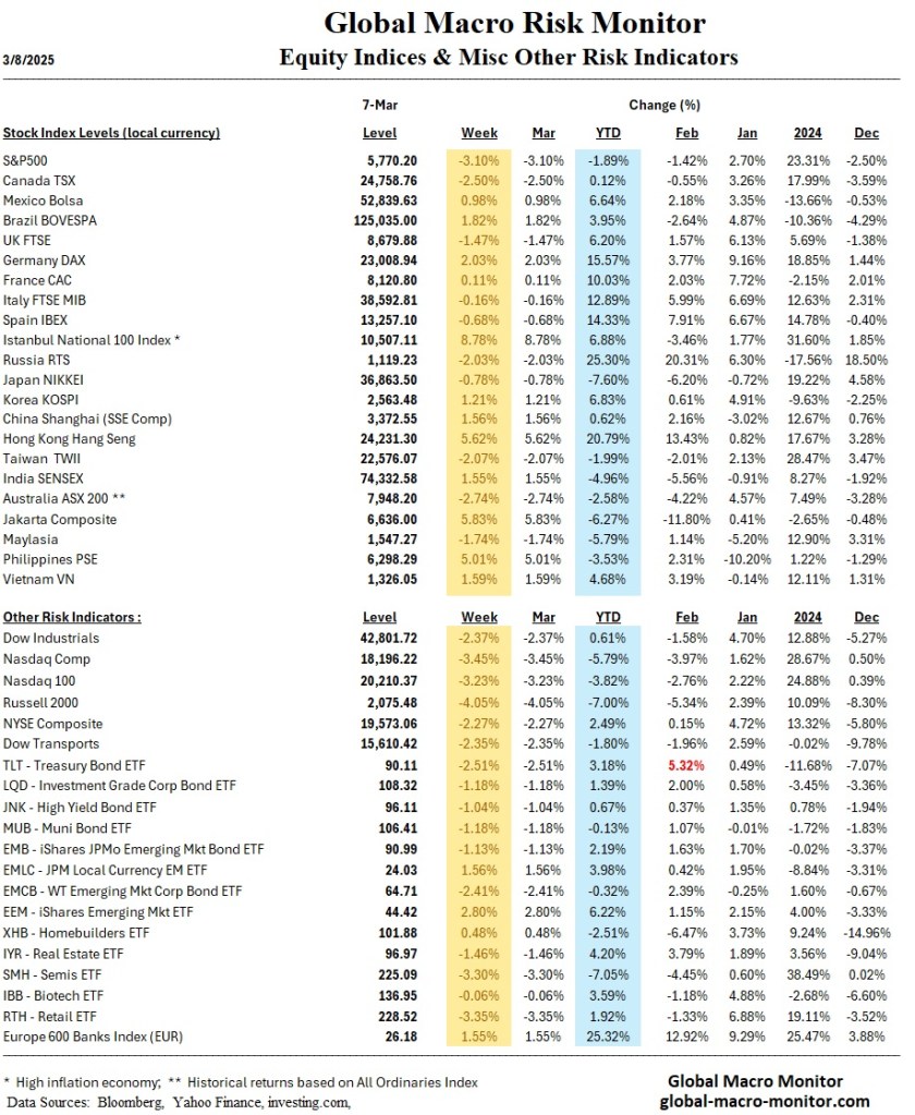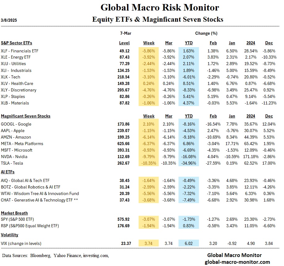 U.S. markets experienced considerable volatility this past week as Trump’s shifting tariff policies caused uncertainty among investors. The announcement of 25% tariffs on Canadian and Mexican imports and an additional 10% on Chinese goods led major indices, including the S&P 500 and Nasdaq Composite, to suffer their sharpest declines since September. The S&P 500, after penetrating key support, managed to rally into the Friday close.