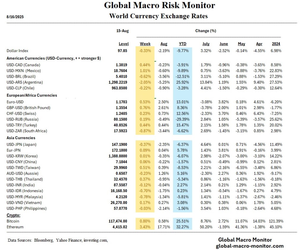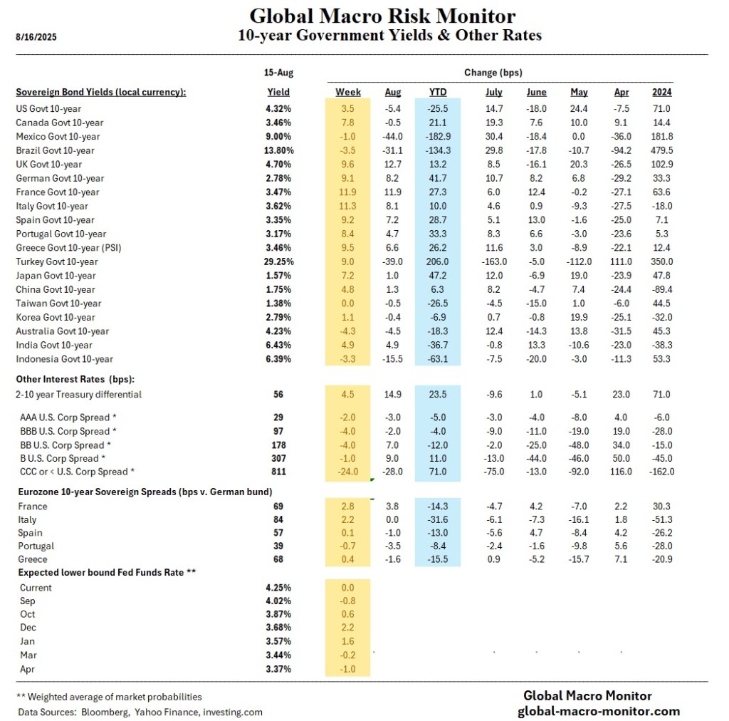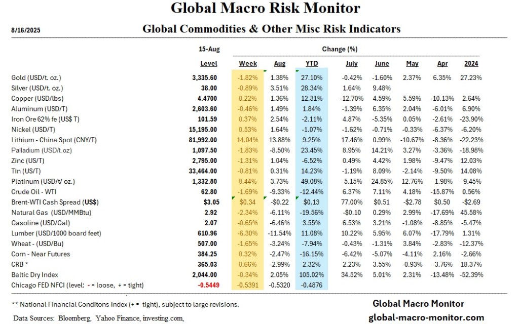 - Trade tensions remain elevated; Trump’s tariff rhetoric and upcoming meetings (e.g., with Putin) introduce uncertainty.