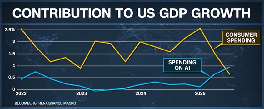 The biggest hyper scalers…the big tech companies, like Meta and Microsoft are spending hundreds of billions of dollars, maybe up to $400 billion this year, on the infrastructure to build Artificial Intelligence…Last quarter, spending on Artificial Intelligence added more to GDP than total consumer spending…That statistic is completely crazy, consumer spending is 70 percent of the economy. — Dereck Thompson