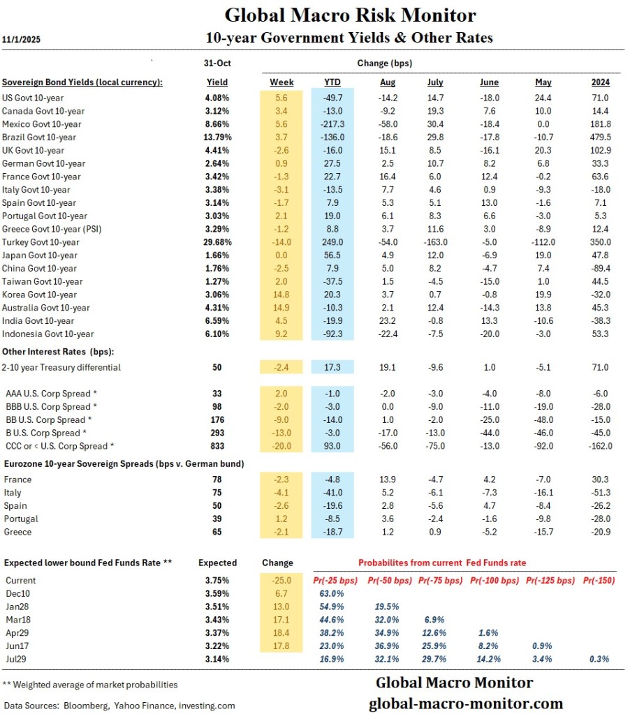 - The Federal Reserve cut the target range for the federal funds rate by 25 bps to 3.75%–4.00%, marking a second consecutive easing.