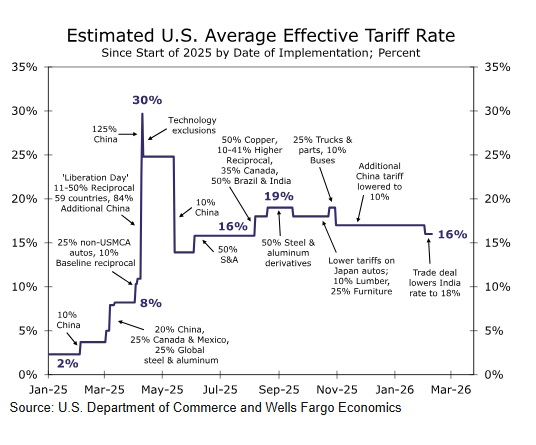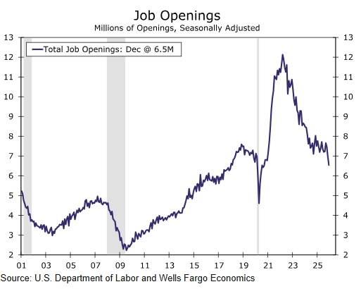 Wells Fargo published a pair of charts this week that appear to tell very different stories. On the one hand, higher tariffs are being promoted as a catalyst for job creation. On the other, job openings continue to slide meaningfully. It is increasingly difficult to reconcile those narratives. More plausibly, the growing drag on labor demand reflects the accelerating impact of AI, as productivity gains allow firms to do more with fewer workers.