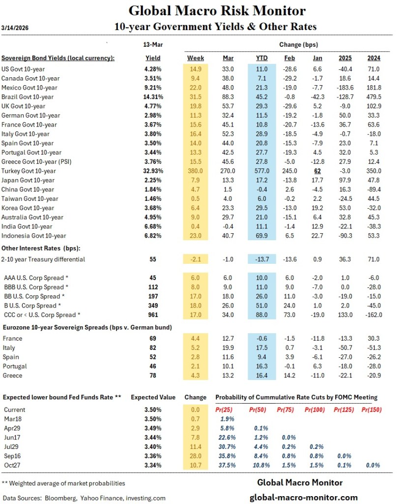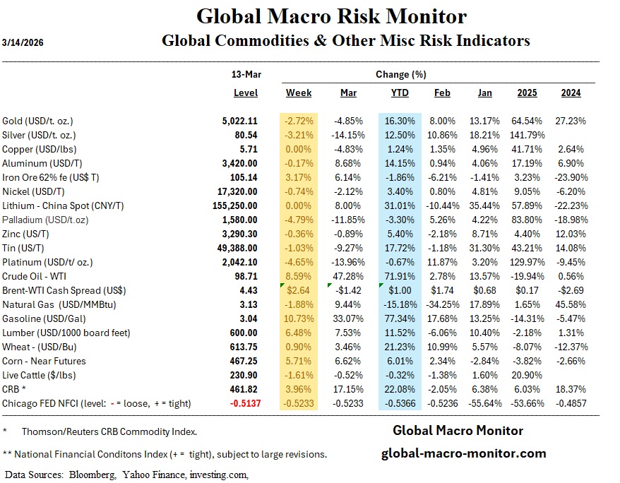 Global markets ended the week in classic late-cycle fashion: equities tried to look composed, while everything underneath them looked increasingly less so. The dominant macro transmission channel was energy. The Iran conflict and the closing of the Strait of Hormuz injected a fresh geopolitical risk premium into oil, with WTI briefly spiking near $119 before settling closer to $98 by week’s end. That oil shock pushed yields higher, strengthened the dollar, widened credit spreads, and forced markets to push out the probabilities of Fed easing to much later in the year, because stagflation worries remain the gift that keeps on giving.
