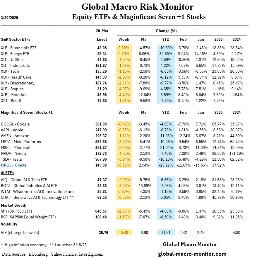 - Sector dynamics: Energy (+3% weekly, +30% YTD) is the clear outperformer, acting as a geopolitical hedge. Rate-sensitive sectors (homebuilders, real estate) and consumer defensives (staples) underperformed, reflecting both higher yields and demand concerns.