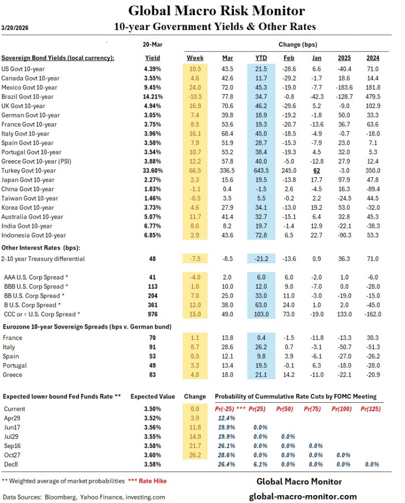 Energy is the transmission mechanism. The Iran war escalation, coupled with heightened risk to shipping lanes through the Strait of Hormuz, has injected a persistent risk premium into crude markets. The Brent-WTI spread widening to ~$14 (an 11-year high) is not just a curiosity, it reflects global supply fragility versus U.S. relative insulation. Markets are effectively pricing in the possibility that energy flows could be disrupted, even if only intermittently. That’s enough to keep inflation sticky and central banks cautious.