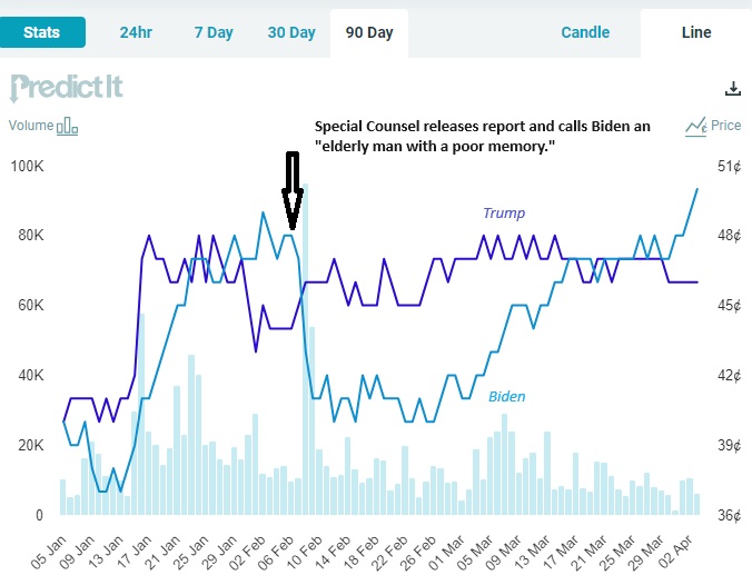 President Biden has fully recovered from the downturn in his election prospects, as observed in the prediction markets after the Special Counsel described him as a “sympathetic, well-meaning, elderly man with a poor memory.”