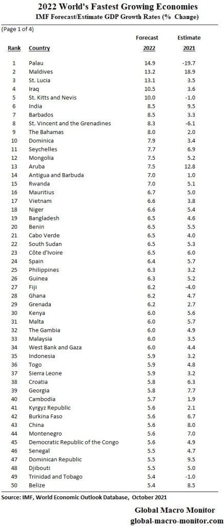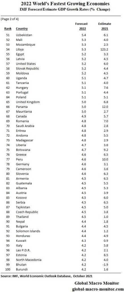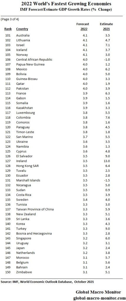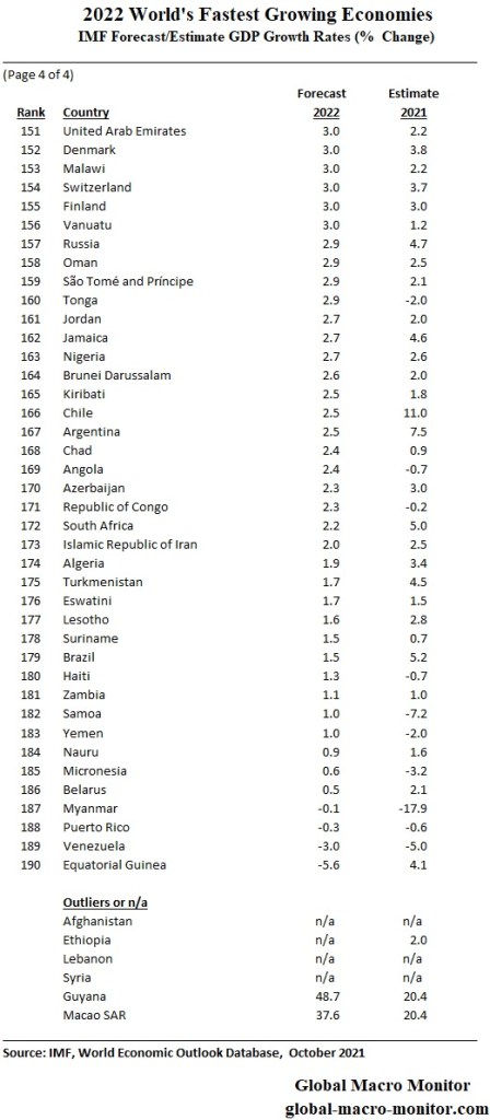 We have updated our tables of the IMF’s forecast and estimates of GDP growth rates for the G20 and the rest of the world for 2022 and 2021. The post has always been a favorite for our readers. The 2022 forecast ranks the world’s fastest to slowest growing economies in the ginormous table below.